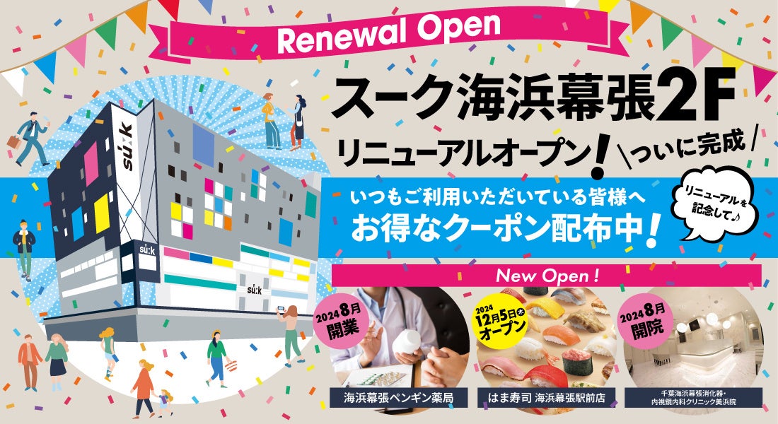 この度、丸紅リアルエステートマネジメント株式会社が運営管理を行う「スーク海浜幕張」の2Fがリニューアルオープンすることが決定いたしました。リニューアルオープンに際して特設サイトを開設(特設サイト運営事務局:オニオン新聞社)。いつもご利用いただいている皆様へ、リニューアルを記念して、お得なクーポンを配布します!各店舗でご利用いただけるクーポンは、2024年12月2日(月)〜2025年1月31日(金)の期間限定となっておりますので、この機会にぜひお越しください。皆様のご来店をお待ちしております!