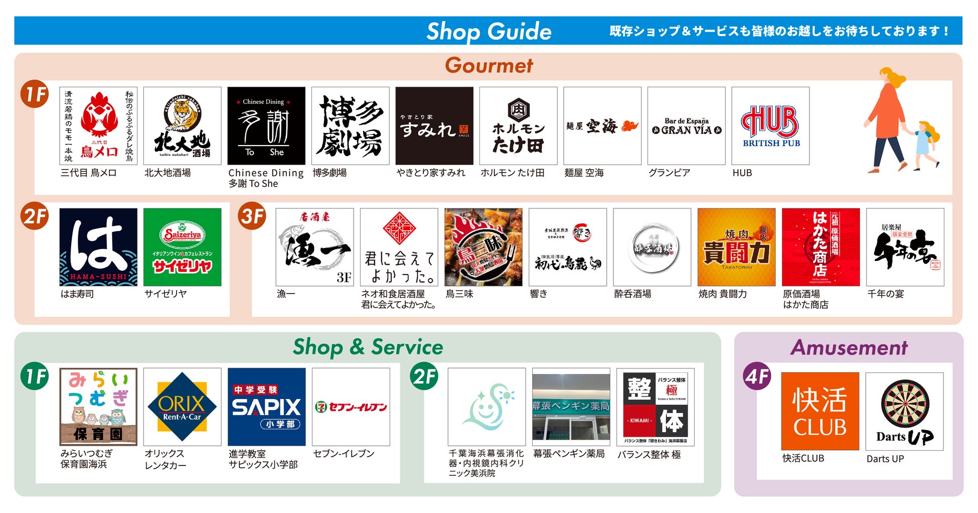 スーク海浜幕張は、“食と遊の輝く時間”をキーワードに、さまざまなジャンルのグルメ他、コンビニエンスストアや整体院などのサービス、ダーツバーや漫画喫茶などのアミューズメントまで揃った、ご家族やお友達と楽しめる商業施設です。