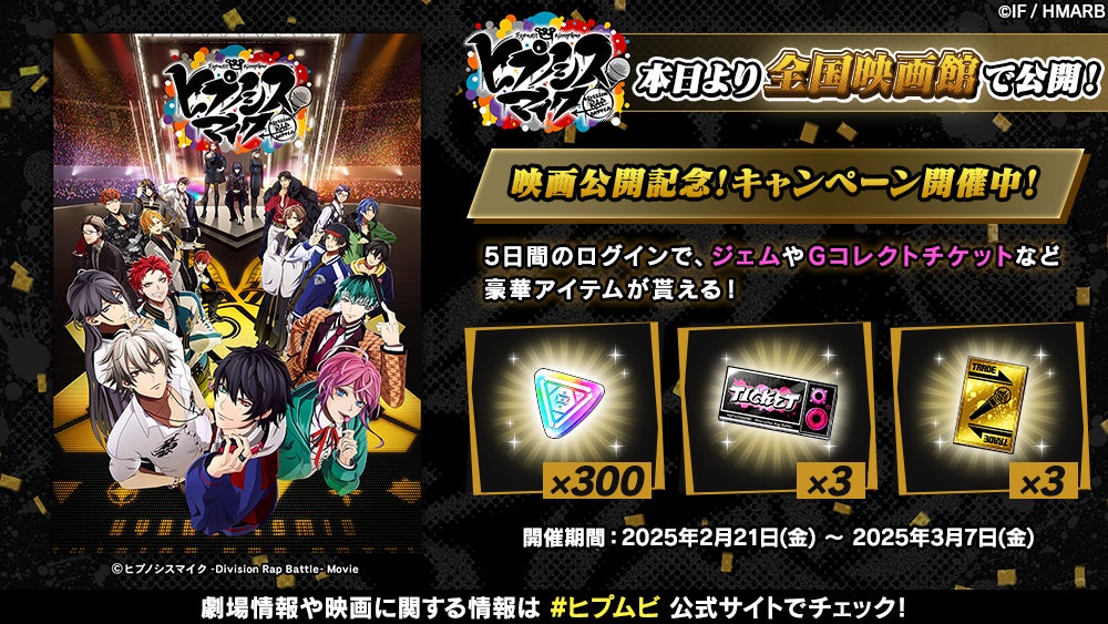 現在絶賛公開中の映画『ヒプノシスマイク -Division Rap Battle-』の上映を記念して、公開記念キャンペーンを開催しています。5日間のログインで、ジェムやGコレクトチケットなどのアイテムが獲得できるほか、[10回Gコレ]を有償300ジェムで回せるお得なGコレクトも開催中です。