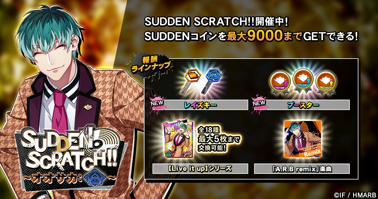 イベント期間中、KILLER SCRATCH!!をプレイするとライズ消費量に応じた確率でSUDDEN SCRATCH!!が発生します。SUDDEN SCRATCH!!をプレイすると、通常の報酬アイテムの他、限定アイテム「SUDDENコイン」を獲得することができます。「SUDDENコイン」を集めることで、レイズキーやオオサカ・ディビジョンのデコステッカーに使えるブースターなどと交換することが可能です。他にも、ストーリーカードの【Live it up】シリーズ、「A.R.B remix」楽曲などがラインナップされています。