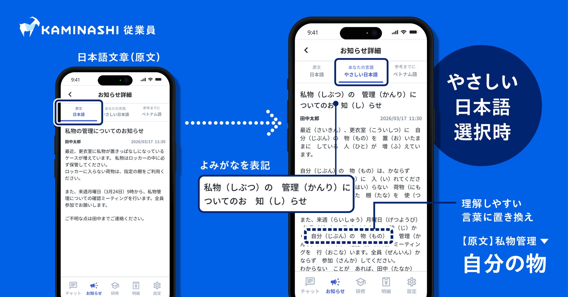 株式会社カミナシ(本社:東京都千代田区、代表取締役CEO:諸岡 裕人、以下「カミナシ」)が開発・提供する『カミナシ 従業員』は、ビジネスコミュニケーションツールとして日本初(※1)となる「やさしい日本語」表示機能を追加しました。本機能により、技能実習生や特定技能外国人などの外国人材は、自身の日本語力に応じて「母国語」「やさしい日本語」「日本語」から最適な言語を選択できるようになります。働きながら日本語を習得できる環境を整えることで、現場における「言葉の壁」を解消し、より円滑な意思疎通を実現します。