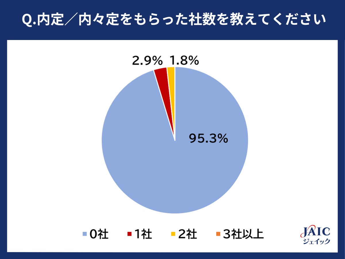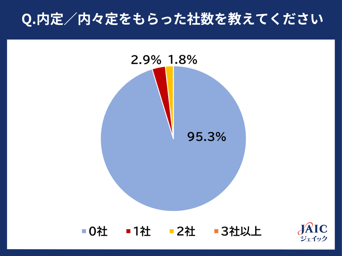 「内定/内々定をもらった社数を教えてください」と質問したところ、「0社」が95.3%、「1社」が2.9%、「2社」が1.8%、「3社以上」が0.0%となり、全体の9割強が未内定という結果となりました。