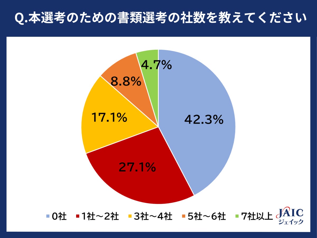 「書類選考を受けた社数を教えてください」と質問したところ、「0社」が42.3%、「1~2社」が27.1%、「3~4社」が17.1%、「5~6社」が8.8%、「7社以上」が4.7%となり、全体の約6割(57.7%)が1社以上に応募している結果となりました。