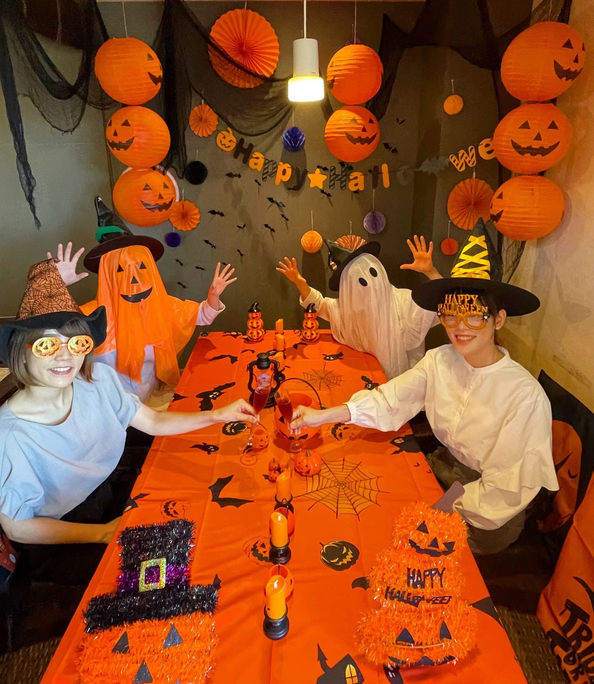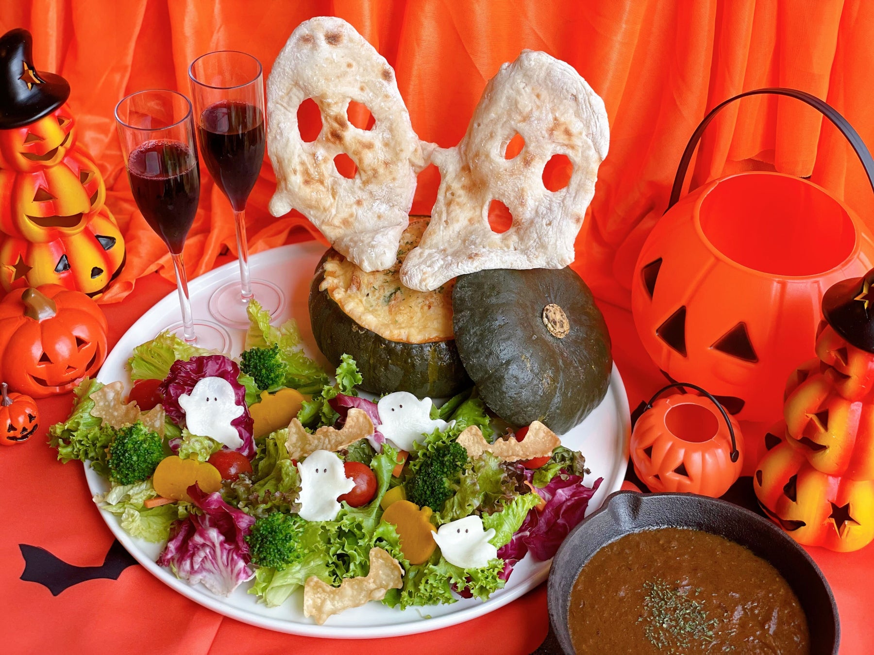 装飾されたプライベートスペースでのパーティープランです。特別フードとして、ハロウィーン仕様のBIGぱんケーキ4,000円(税込)、まるごとカボチャのグラタンとオバケナンのディップカレー5,000円(税込)をご用意しています。