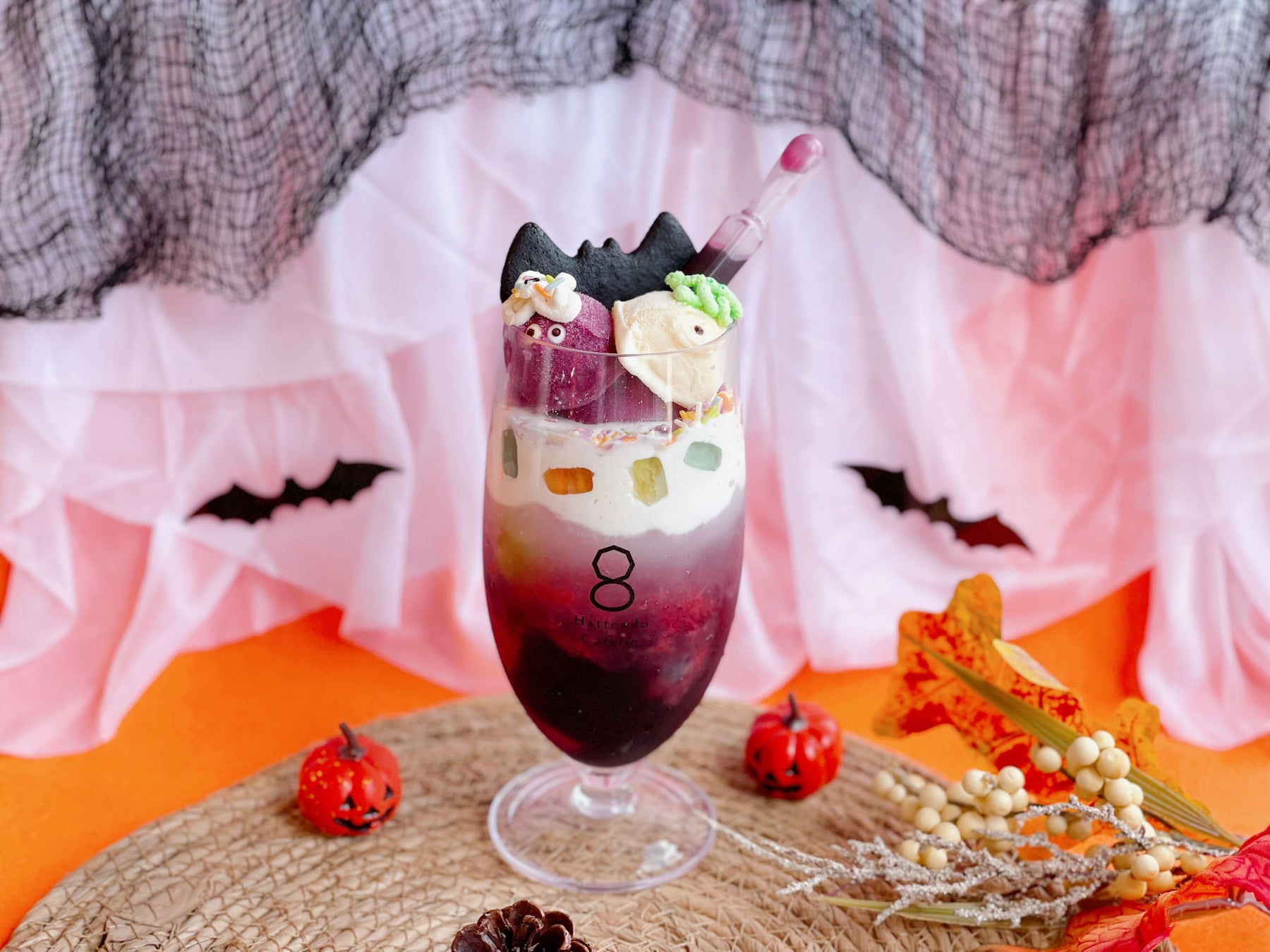おばけモンスターが乗った限定ドリンクは八天堂ファームのフレッシュなぶどうも使用しています。