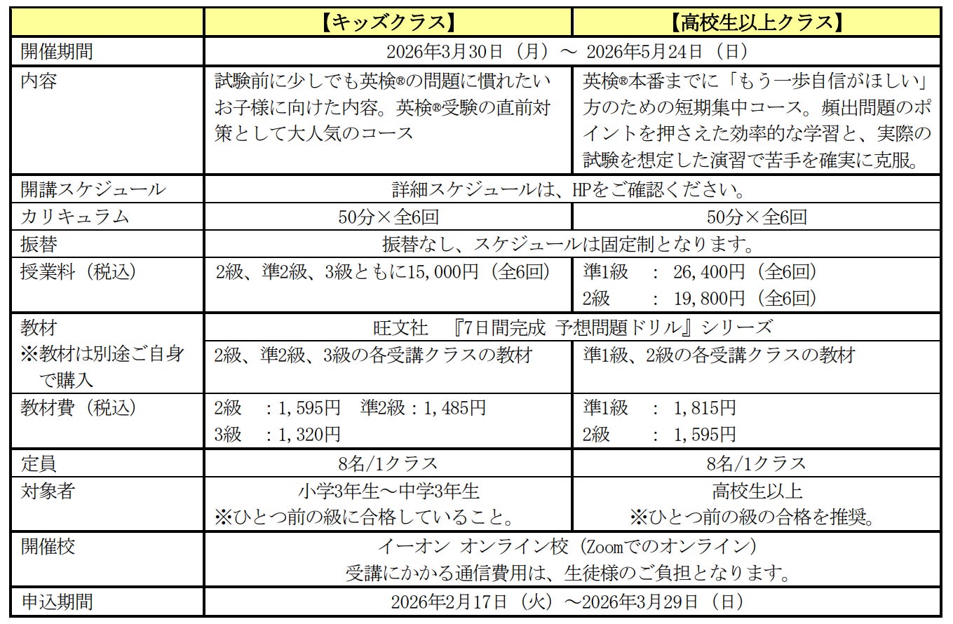 英会話教室を運営する株式会社イーオン(本社:東京都新宿区、代表取締役社長:重野卓、以下「イーオン」)は、2026年5月31日(日)に行われる英検(R)に向けて、オンライン校のキッズクラス及び高校生以上のクラスで「英検(R)対策直前コース」を開講します。本コースでは、一緒に一次試験の問題を解きながら問題に慣れ、解き方のコツを学びます。解いた問題の解説もあるので、英語の理解も深まります。