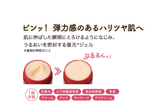 シワ改善とシミ対策★を1品で叶えるオールインワンタイプ。有効成分ナイアシンアミド配合。ピンっと弾力感のあるハリツヤ肌へみちびきます。うるおいを密封する復元*ジェル。華やかなローズフローラルの香り。100g