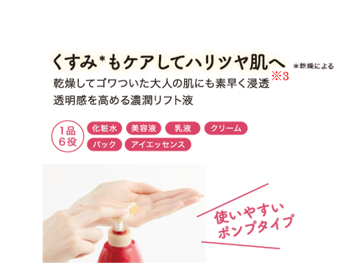 大人の肌に贅沢なうるおいとハリツヤをあたえる「うるおいリフト×ハリツヤ成分」と「赤の贅沢保湿成分」を配合しています。