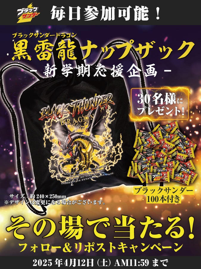 有楽製菓株式会社(本社:東京都小平市、代表取締役社長:河合辰信)が展開するチョコレート菓子「ブラックサンダー」は、新学期応援企画として、オリジナルデザインの黒雷龍(ブラックサンダードラゴン)をあしらったナップザックを製作し、2025年4月7日(月)より公式Xにてプレゼントキャンペーンを実施します。
