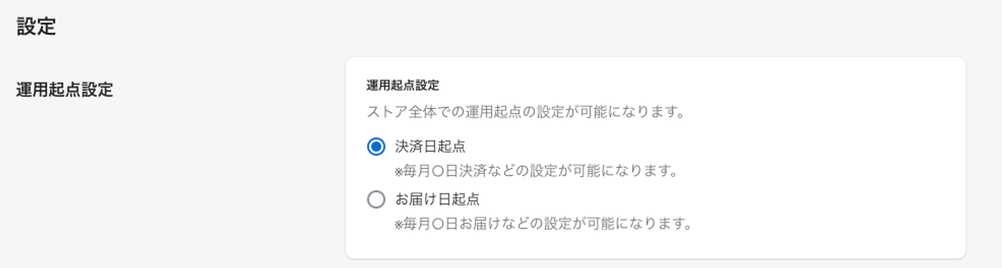 「一般設定>運用起点設定」の項目が追加され、ここから「決済日起点」または「お届け日起点」が選択可能となります。