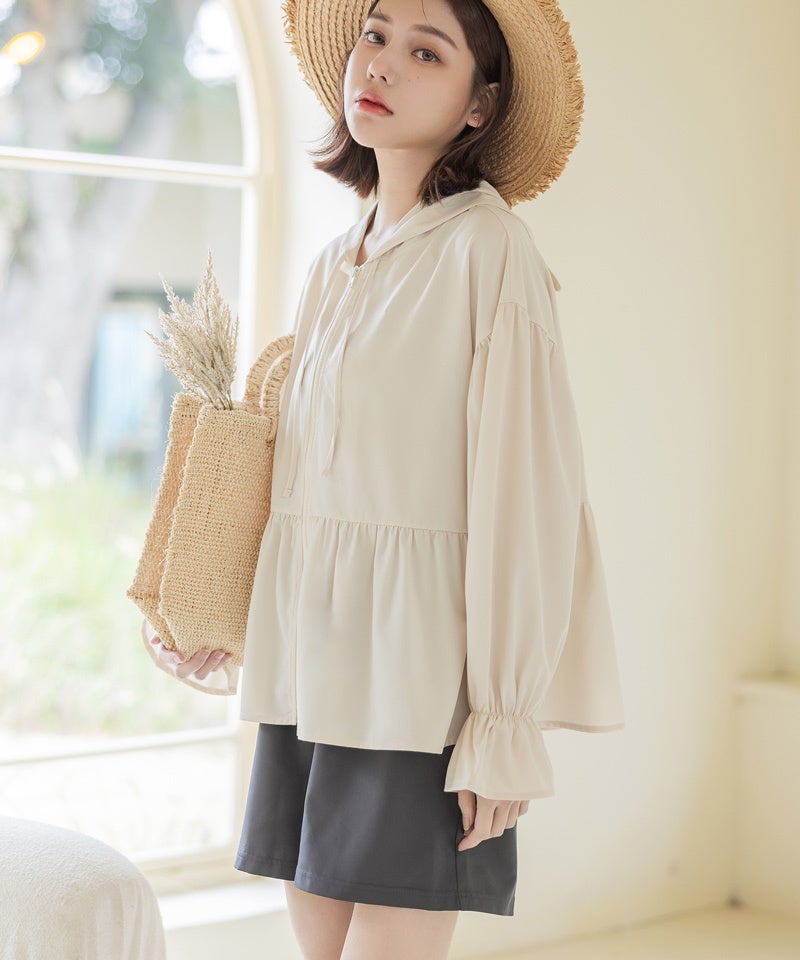裾に向かって広がる軽やかなフリルデザインで女性らしさを演出します。お尻が隠れる丈感で、ヒップラインもさりげなくカバー。