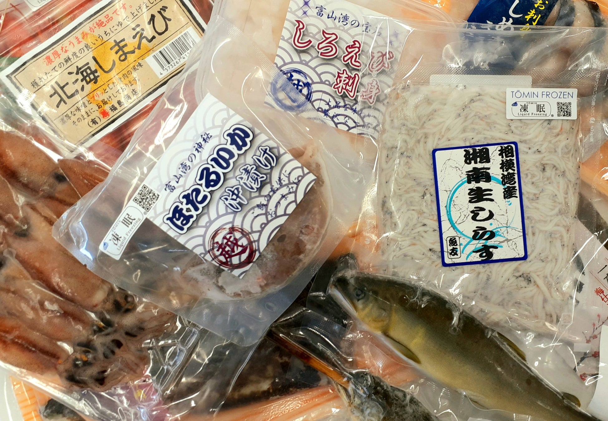 ㈱テクニカン直営の冷凍ショップ<TŌMIN FROZEN(トーミンフローズン)>で取り扱う「ばらちらし」や「五目焼きそば」のほか、各産地でそのまま液体急速凍結した旬の魚介類、前回開催時にご好評いただいた人気デパ地下商品を“冷凍”で販売いたします。