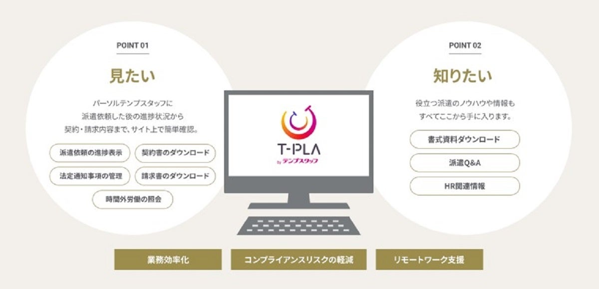 一方、当社ではテクノロジーの活用により、営業担当がより人の介在価値を高めていくことにこだわったDXに取り組んでまいりました。派遣先企業が派遣活用において知っておきたい法律知識や派遣スタッフ契約・請求管理、時間外労働の照会など、派遣先として対応が必要なことが手軽に確認できるプラットフォームとして、2020年9月「T-PLA」の提供を開始し、派遣先担当者約4万人、企業約1万5,000社以上*2が利用しています。