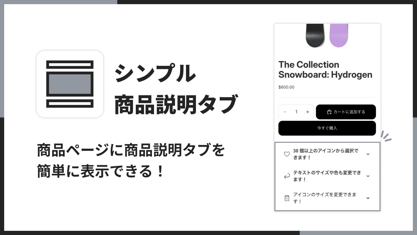 「シンプル商品説明タブ|お手軽折りたたみ可能な行」は、商品ページの情報量が多くても、ユーザーが迷わず必要な情報にたどり着ける UI を実現するアプリです。