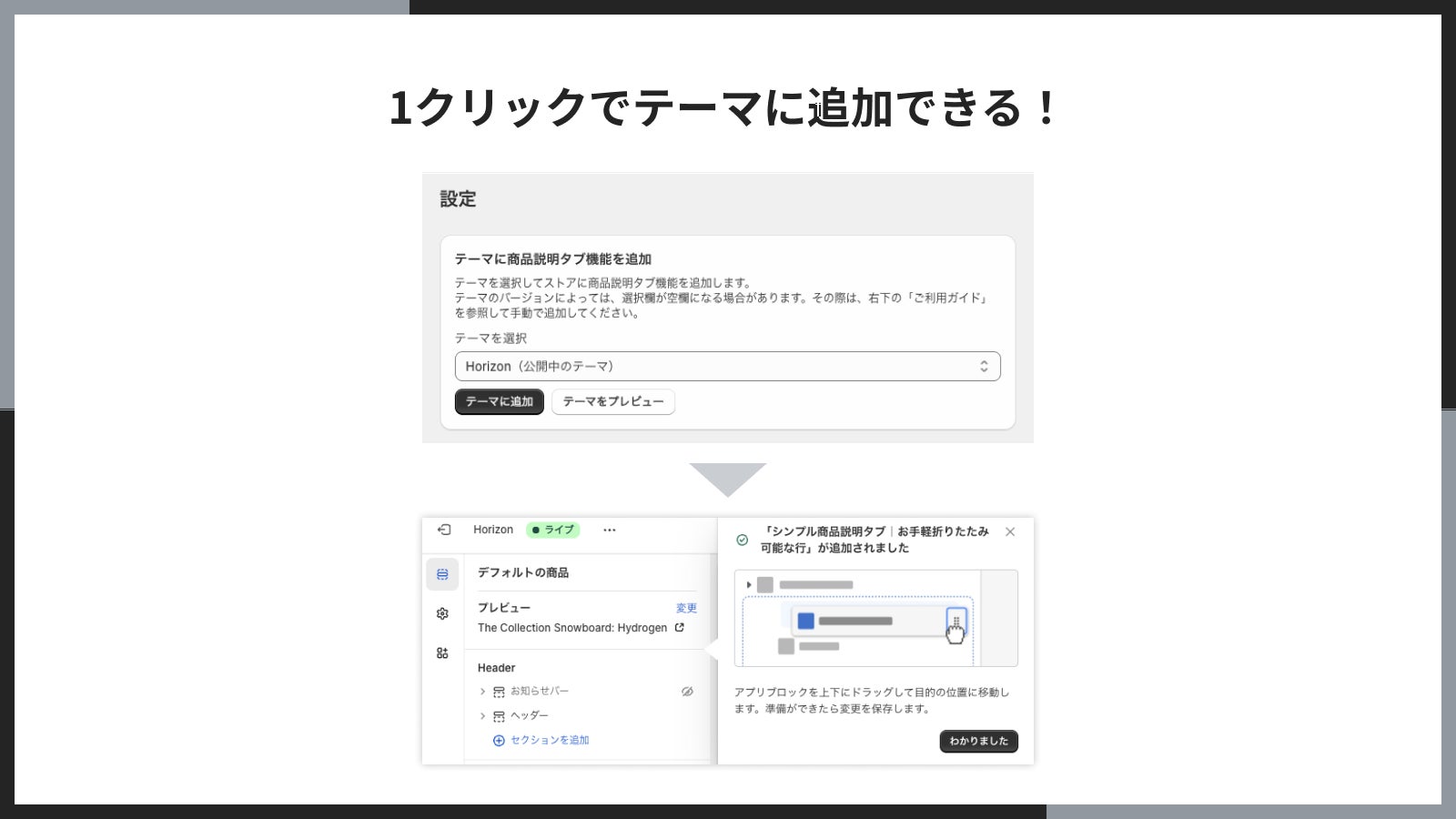 HTML や Liquid の編集は一切不要で、誰でも簡単に導入可能です。