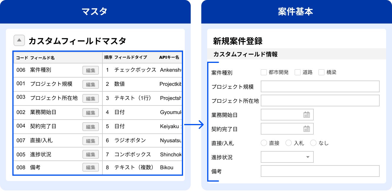 カスタムフィールド機能を活用することで、ユーザー企業は自社の業態やビジネスプロセスに合致した情報管理を実現できます。たとえば、建設コンサルティング業界のユーザーからは、プロジェクトの種別や所在地、詳細な日付情報といった業界特有の項目を柔軟に管理したいという要望が多く寄せられており、本機能でそれらのニーズに対応可能です。