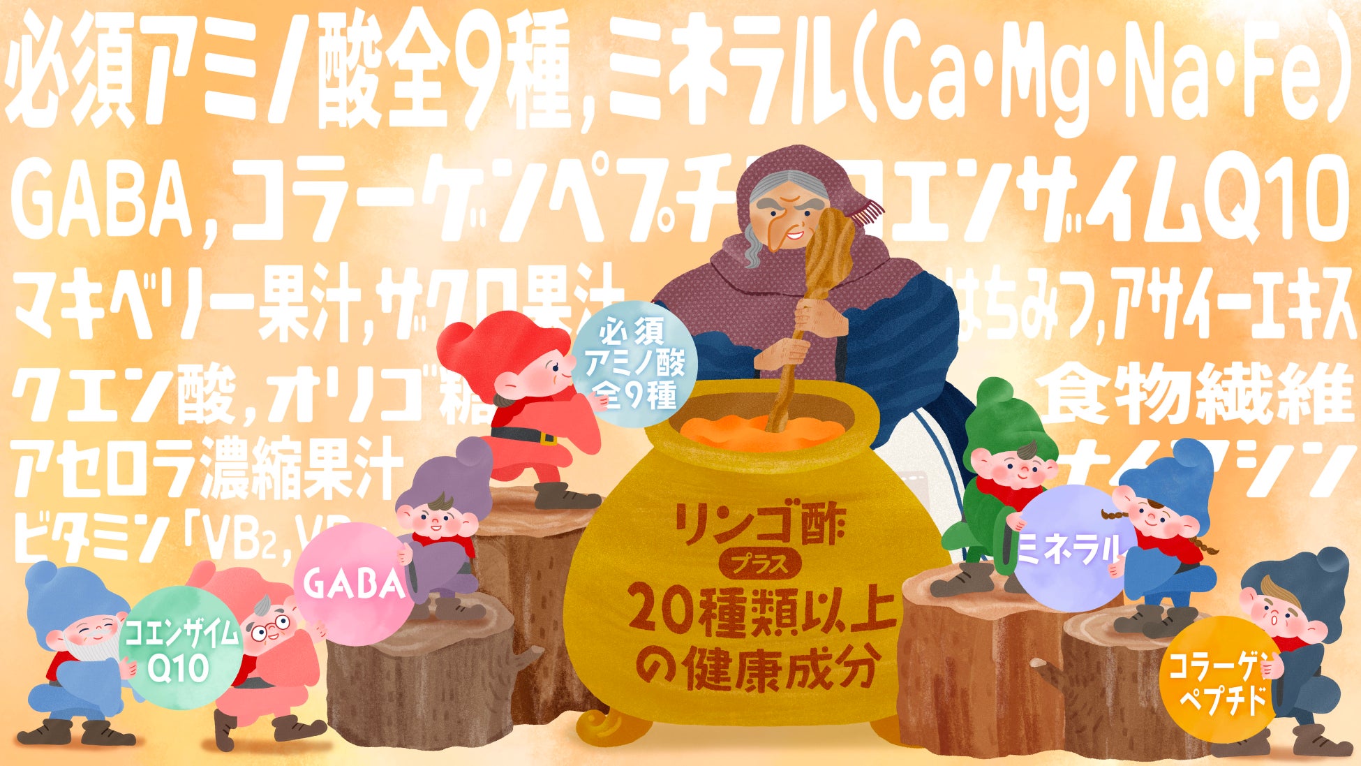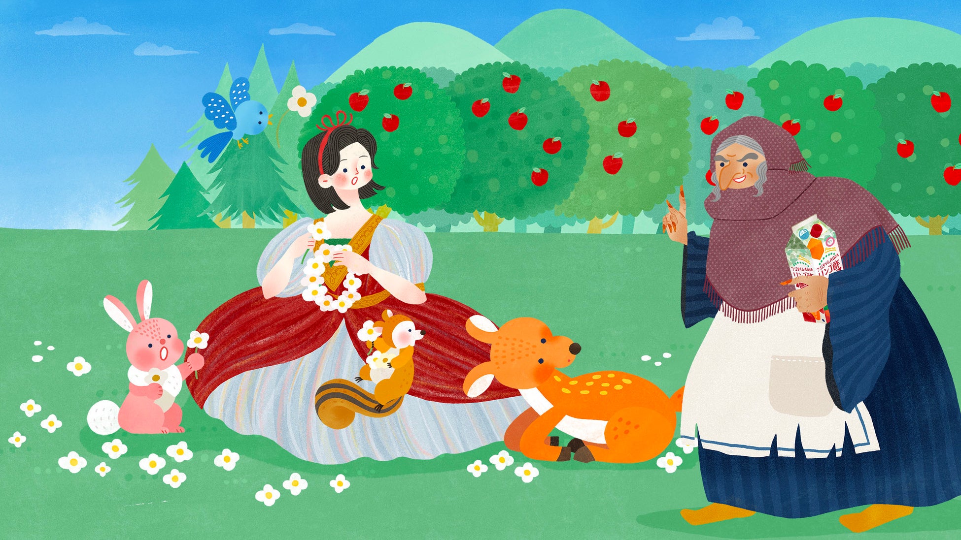 ・狙い:前作とお馴染みの丘で、動物たちと談笑する白雪姫の元にフジタイムAQUAを持った老婆が登場。大鍋を混ぜる老婆の傍らで、小人たちが一生懸命に健康成分を入れるお手伝い...。「健康成分の豊富さ」を、思わず笑みがこぼれるコミカルな演出で表現しました。