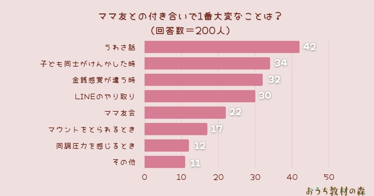 ARINA株式会社が運営する幼児、小学生の親御さん向けの教育メディア「おうち教材の森」(https://naki-blog.com/study/)は、日本全国の中学生以下のお子さんをお持ちの親御さんを対象に「ママ友との付き合いで1番大変なことは?」とアンケート調査を実施しました。その結果を公表します。