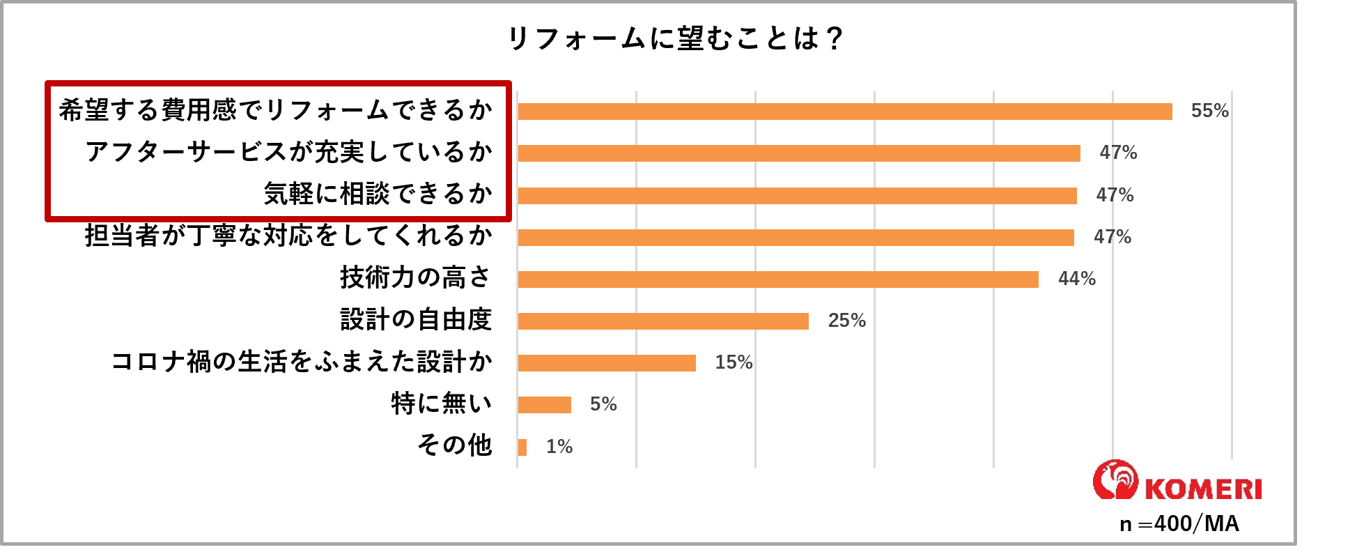 一方で、リフォームに望むことについても伺ったところ、以下のような結果となり「自分が希望する費用感でリフォームできるか」「アフターサービスが充実しているか」「気軽に相談できるか」が重要視されていることがわかりました。費用面の透明性や相談をしやすい環境がリフォームの実施を後押しするようです。