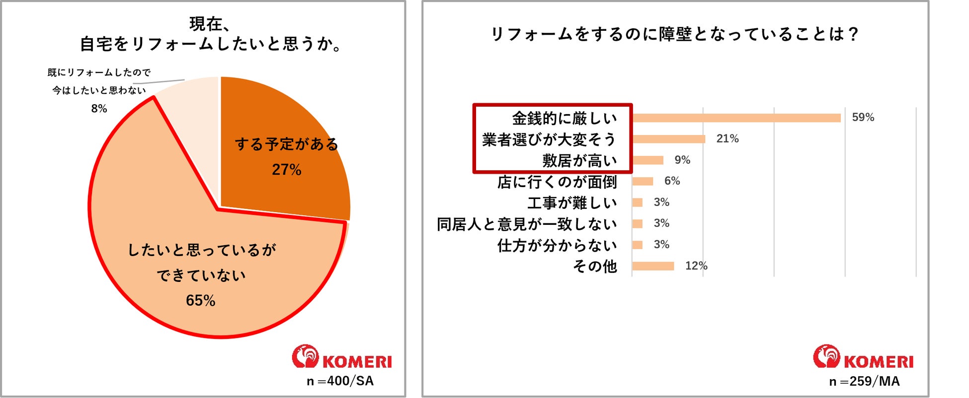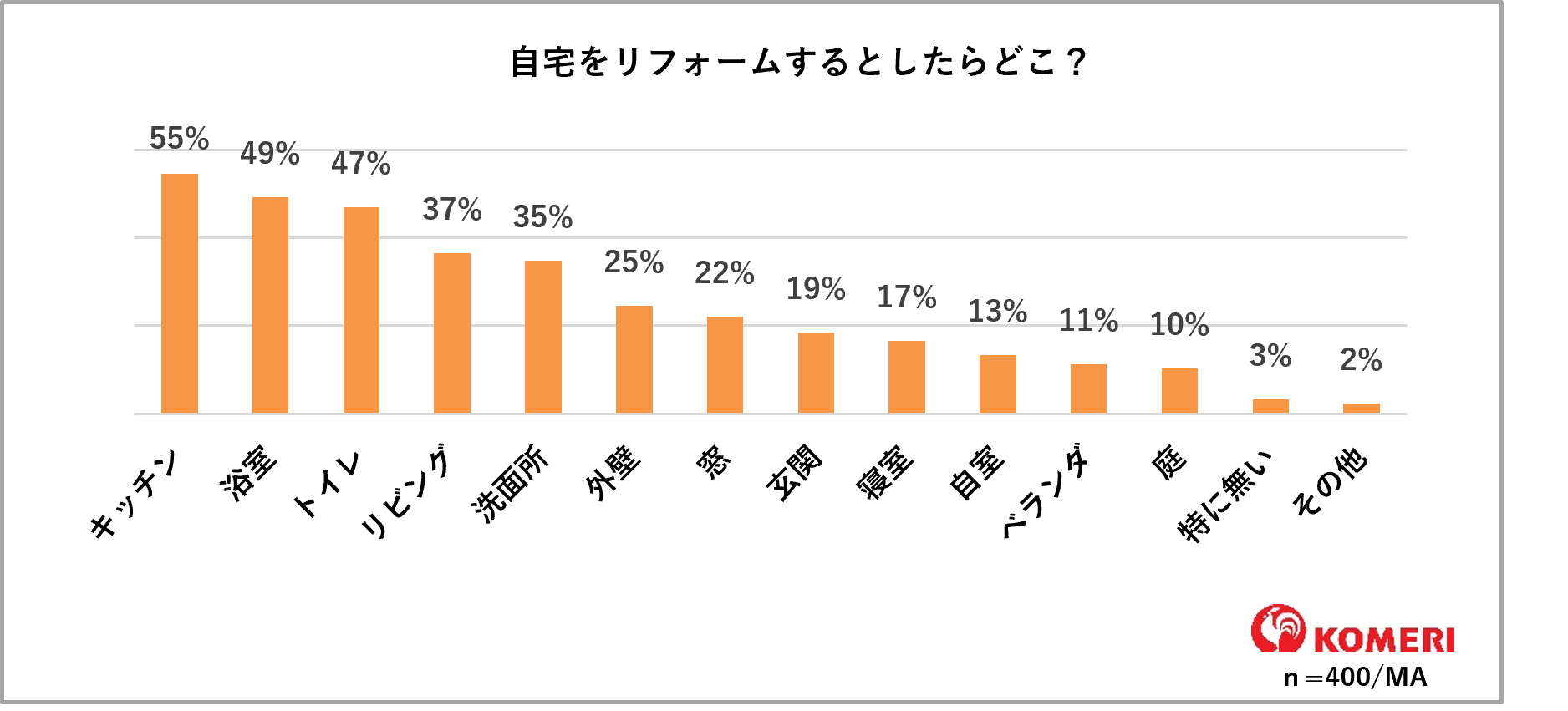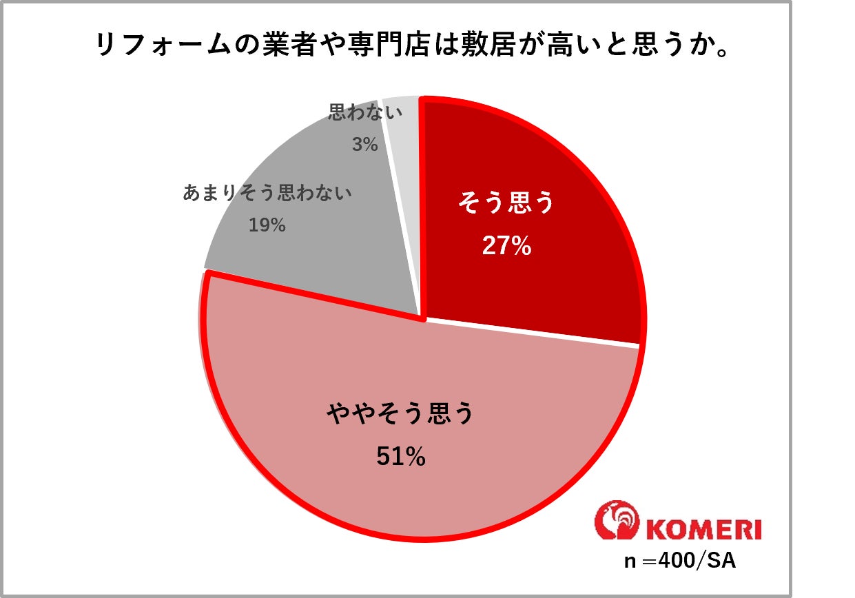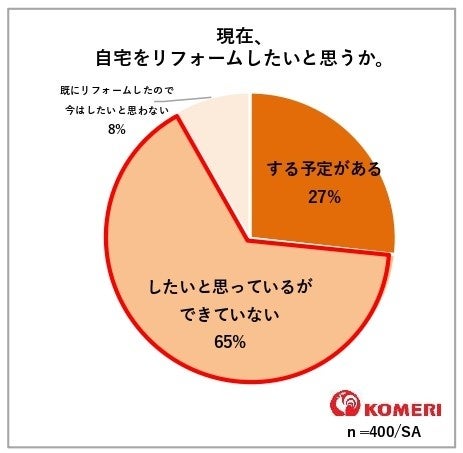 ホームセンターの「コメリパワー」や「コメリハード&グリーン」を通し地域のライフラインとして、地元のプロを応援する株式会社コメリ(所在地:新潟県 新潟市、代表取締役社長:捧 雄一郎)は、新生活シーズンにあわせてリフォームに対する意識調査を行いました。調査では、全国の日常的(月に1回以上)にホームセンターに行く、且つ直近1年以内にリフォームを検討したことがある30代~60代の男女400人を対象に、現在のリフォームへの関心や検討時の不安などについて回答をいただきました。