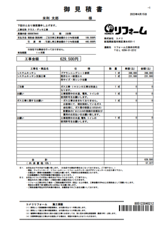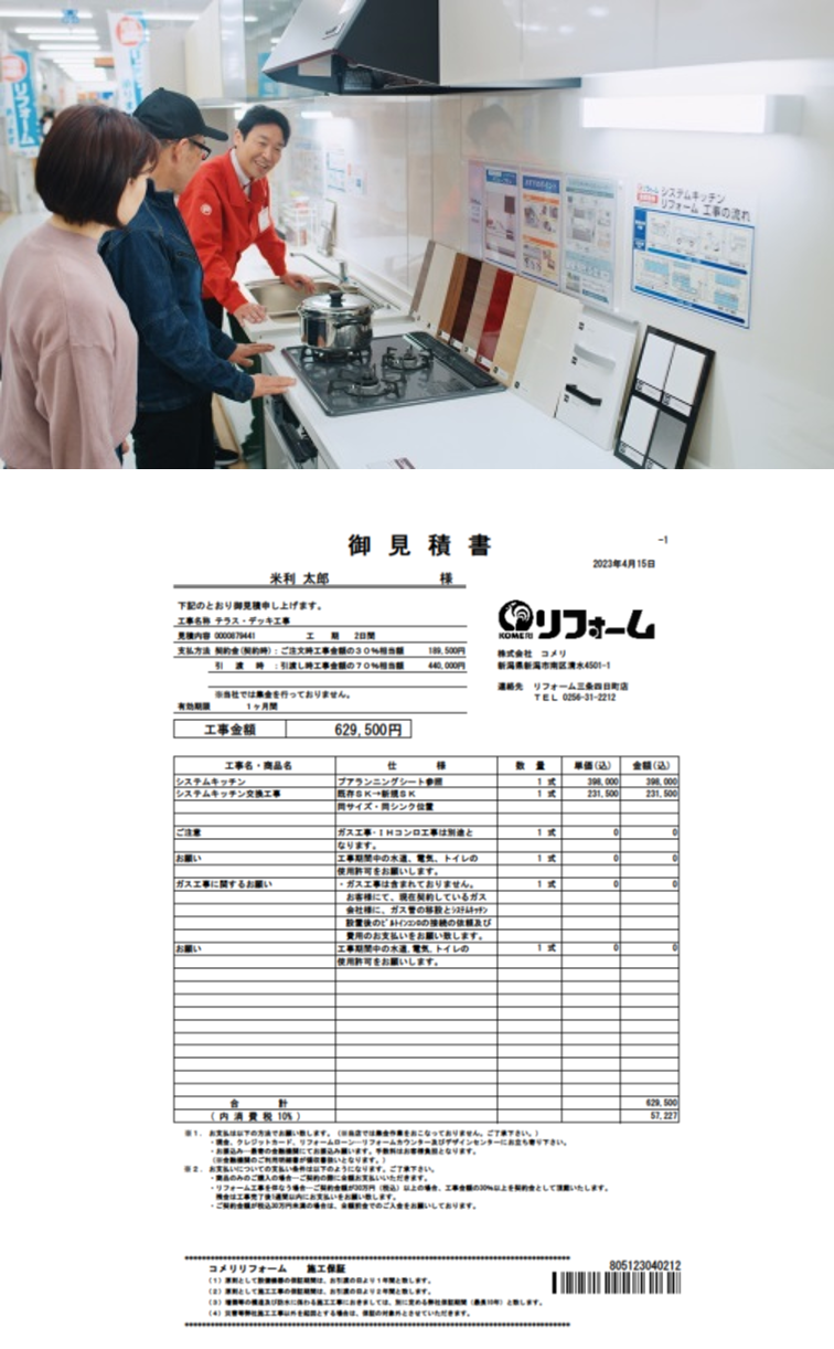 “コメリリフォーム”は商品代と施工費が別々で記載されている見積もりを