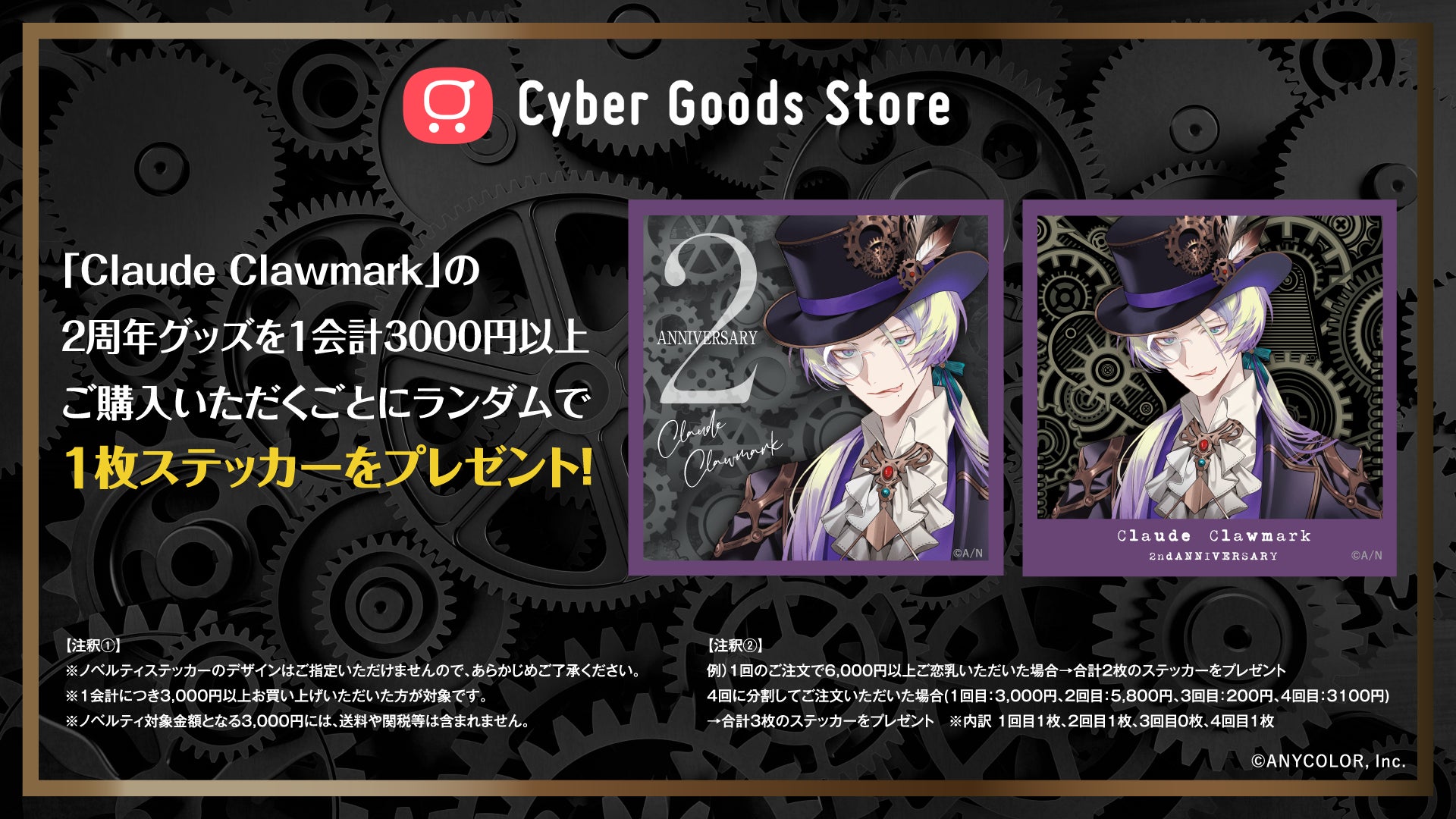 Cyber Goods Storeにて「Claude Clawmark(クロード クローマーク)」の2周年記念グッズを1会計3,000円以上ご購入いただくごとに、ランダムで1枚ステッカーをプレゼントいたします。(全2種)