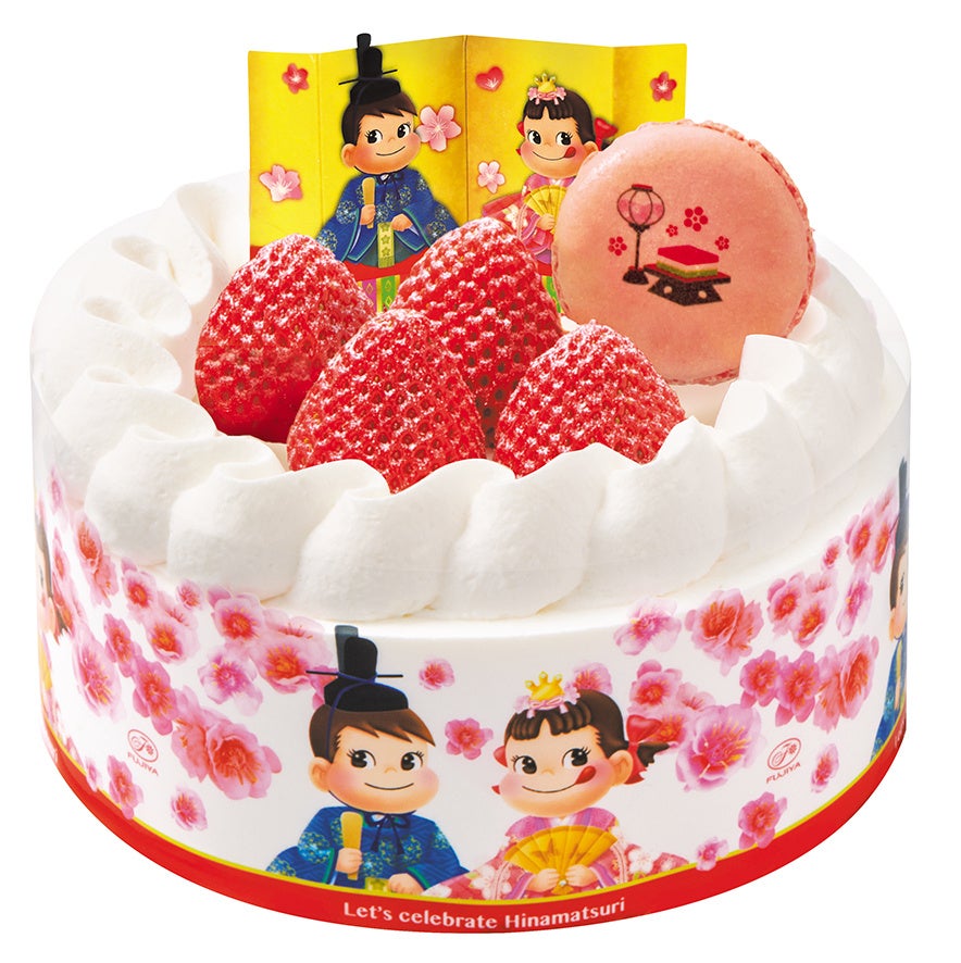不二家の定番「苺のショートケーキ」にひなまつりのデコレーションを施しました。ふんわりとしたスポンジにシャンテリークリームとスライス苺をサンドし、上面にはめびな・おびなに扮したペコちゃん・ポコちゃんをデザインした金の屏風、マカロン皮、国産苺を飾りました。SS、Sサイズで展開します。