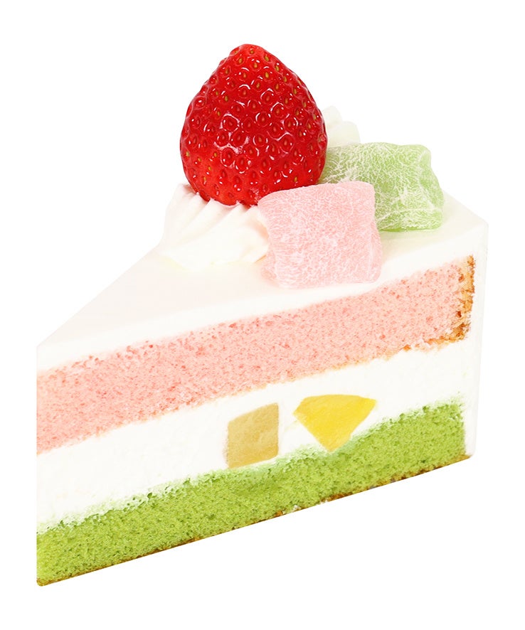 ひし餅をイメージした3層仕立てのショートケーキです。宇治抹茶を使用した緑色のスポンジと桃色のスポンジで黄桃のシロップ漬けとシャンテリークリームをサンドし、上面には国産苺と2色の求肥を飾りました。ひなまつりのお祝いの席を華やかに彩ります。