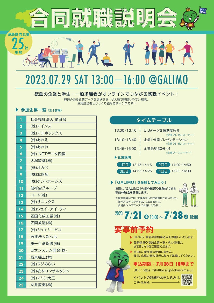 正社員での採用意欲の高い県内企業25社が参加する、徳島県主催の就職イベントです。
