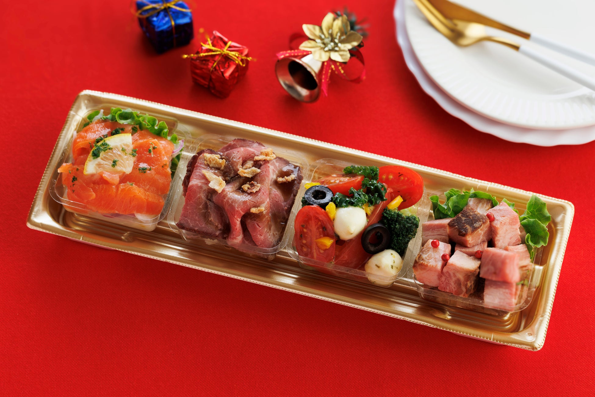 ロートビーフ&マスタードポテト、サーモンマリネ、2種トマトとモッツァレラチーズのジェノバサラダ、ローストポークを一皿にまとめた、肉も魚も楽しめる、前菜にぴったりの盛り合わせです。 |