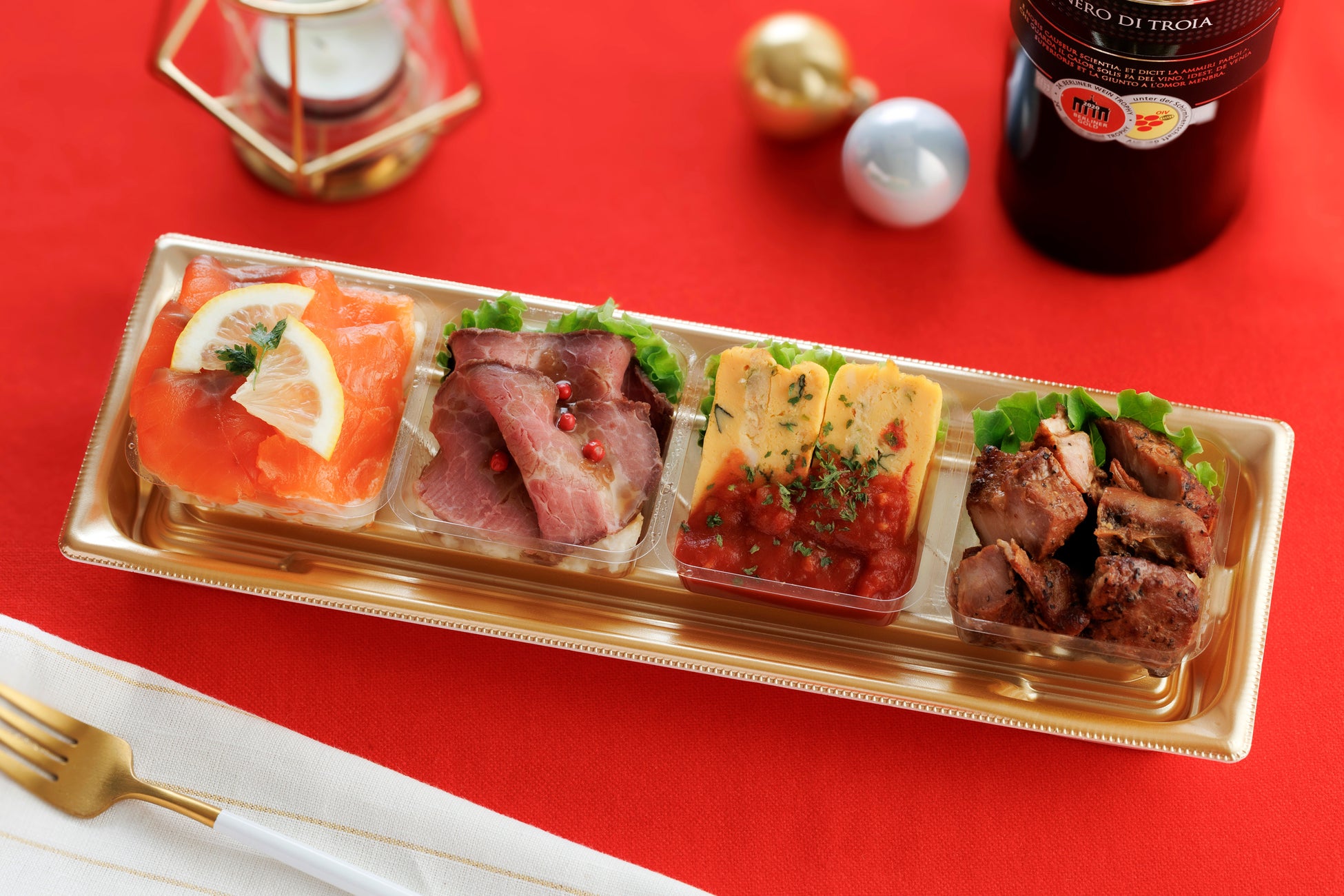 定番のローストビーフやサーモンに、彩り華やかなスペイン風オムレツと、骨なしスペアリブを加えました。様々なテイストの組み合わせで、満足感のある嬉しいセットです。 |