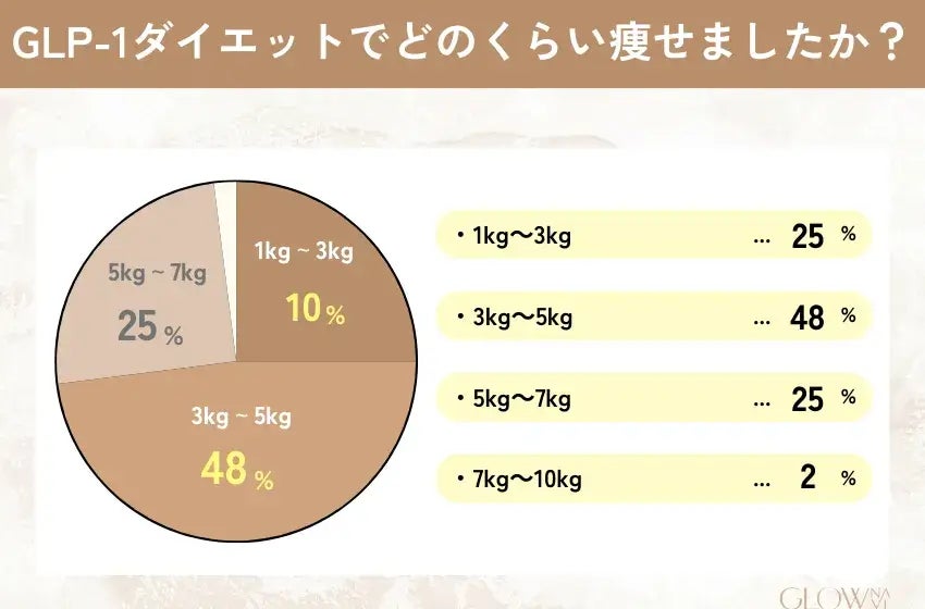 効果については「3kg〜5kg未満」が48%と最多。ただし、GLP-1ダイエットの効果には個人差があり、体質や服薬状況によって異なる可能性があるため、医師の指導のもとで行うことが重要です。