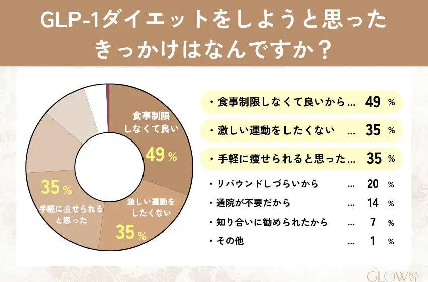 GLP-1ダイエットを始めた理由で最も多かったのは「食事制限をしなくて良いから」(49%)。「激しい運動をしたくなかったから」(35%)、「手軽に痩せられると思ったから」(35%)が続きました。ダイエットに対する心理的負担を軽減できる点が注目されています。