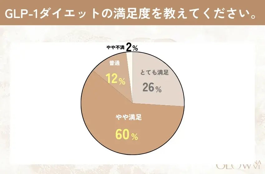 満足度については「とても満足」(26%)と「やや満足」(60%)を合わせて86%が満足している結果に。ただし、GLP-1ダイエットは個人差もあるため、過信せずに医師と相談しながら適切に進めることが重要です。