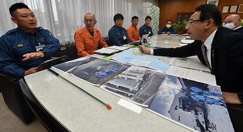 10日に高槻市役所で行われた報告会には、救助活動を終えて帰庁した隊員3人らが参加。被災地で撮影した写真や資料を用い、被災の状況や困難な救助活動の様子を報告。報告を受けた濱田剛史市長は、「被災地へ入ることも難しい中、救助活動を行うことは大変だったと思います」と労いの言葉をかけました。