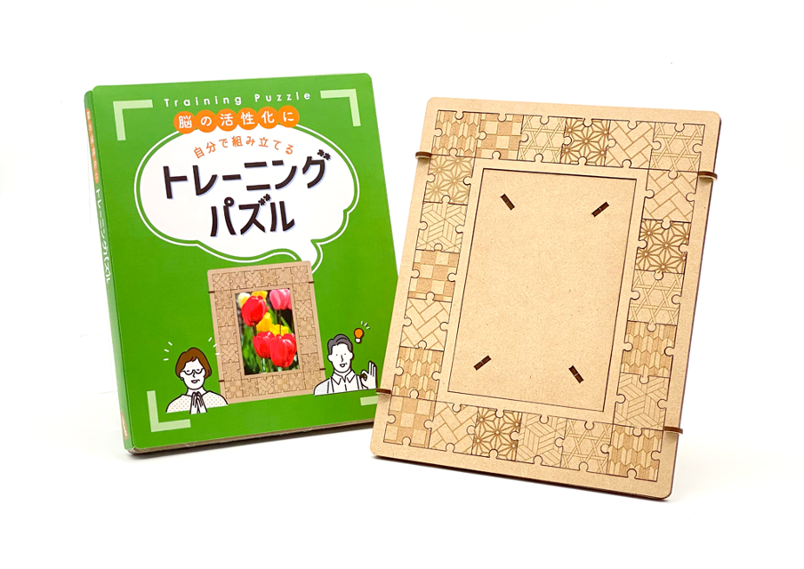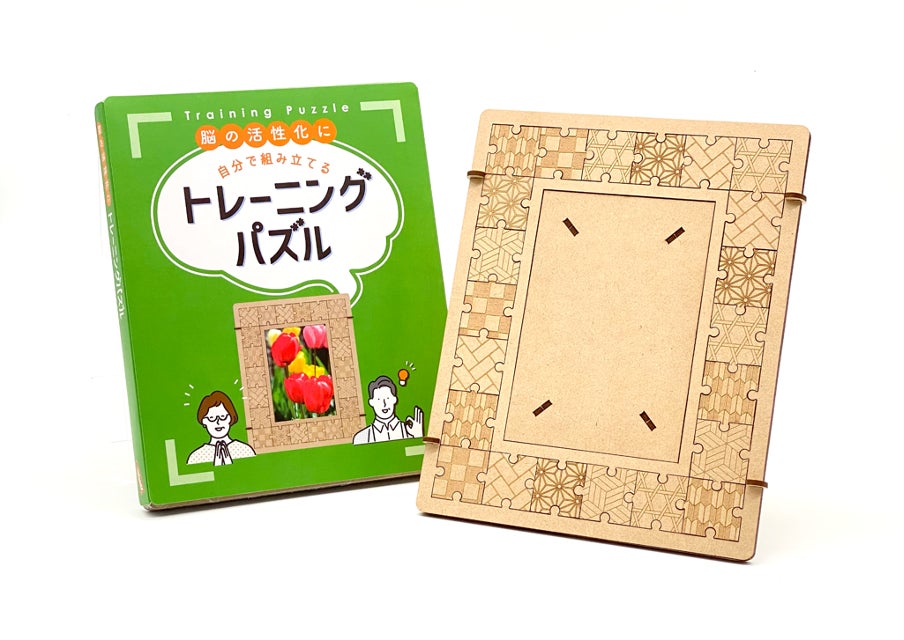 『トレーニングパズル』は、高齢者の脳の活性化を目指して、リハビリ型デイサービス「レコードブック」を展開する、株式会社インターネットインフィニティーと共同開発した商品です。板からパーツを外していき、図解付き説明書に沿って組み立てていくことで、フォトフレームが完成します。図解付き説明書を読みながらパズルを組み立てる動作には、「短期記憶力・情報処理能力・視覚と手の動きの連動」などを育み、脳を鍛える効果が期待できると、脳トレの生みの親でもある川島隆太博士(株式会社NeU 取締役CTO)が実証しています。