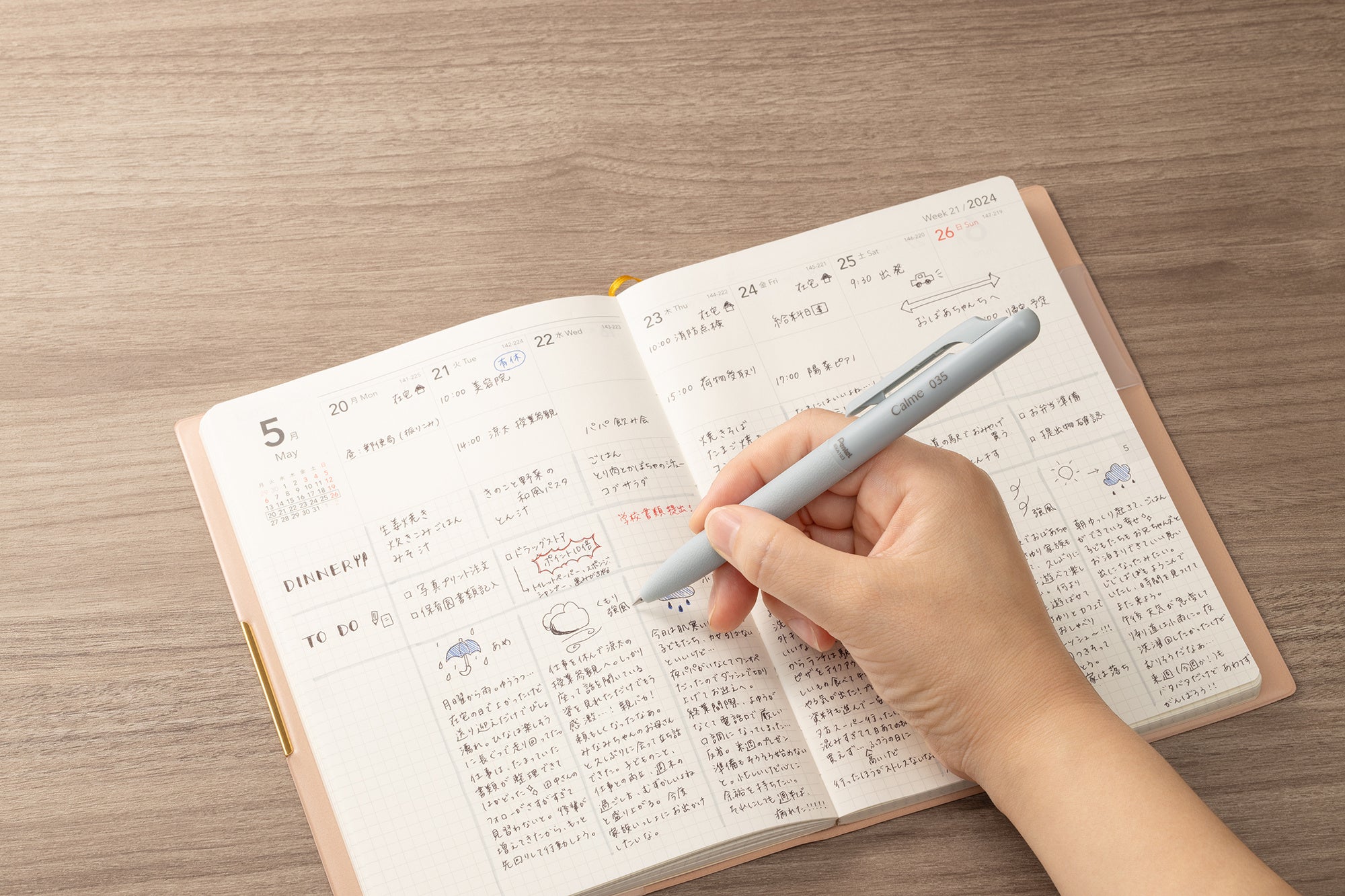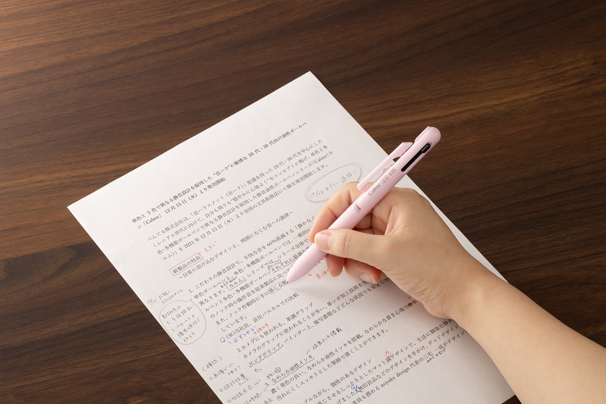 2021年12月に発売したカルムは、そんな意識を持つ世代に向けて「使う人も周りの人も心地よく使えるボールペン」をコンセプトに、書くことに向き合い、考え抜かれて生まれた静音油性ボールペンシリーズです。今回は単色ボールペン、3色ボールペン、多機能ペンの各製品で、ぺんてるの油性ボールペンとしては初めての0.35㎜を発売いたします。カルムの濃くなめらかな書き味はそのままに、小さなスペースへの筆記や細かい文字を書く際にも最適な1本です。