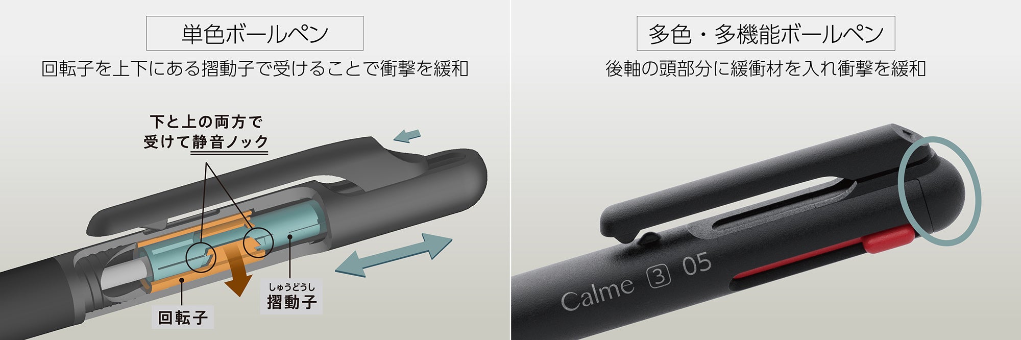 ・単色と多色・多機能ボールペンで異なる静音設計で、66%低減した「静かなノック感」