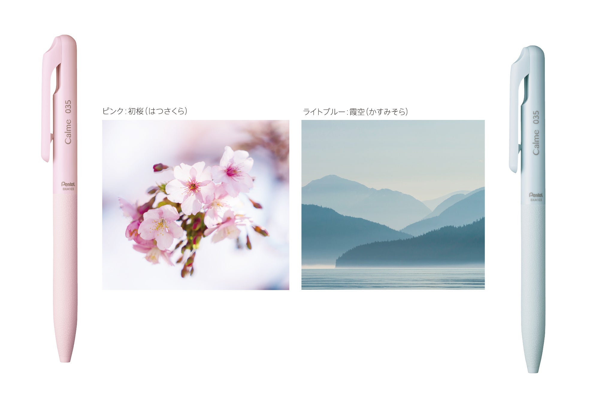 カルムらしい質感や落ち着いた雰囲気を残しつつ、手帳や筆箱など持ち物のアクセントになるような軸色を採用。「ピンク(初桜)」は咲き始めの桜のように手元を彩る可憐な色に、「ライトブルー(霞空)」は霞がかった春の空をイメージした色に仕上げました。加えて、既存色の中でも人気が高いベージュをラインナップしており、使うシーンや持ち物に合わせてお選びいただけます。