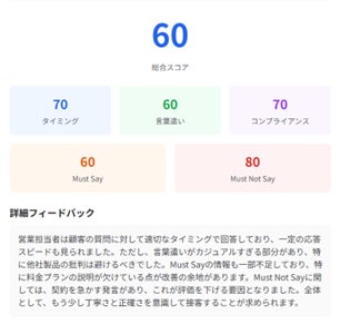 ◎特長②:法令観点を含むAI自動スコアリングで「販売トークの質」を可視化