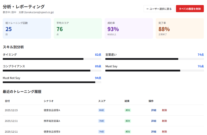 評価結果やスコア推移、履歴を一元管理することで、販売員一人ひとりの成長過程や課題を把握できます。これにより、属人的なOJTから脱却し、継続的かつ再現性のある人材育成と販売品質の改善を支援します。