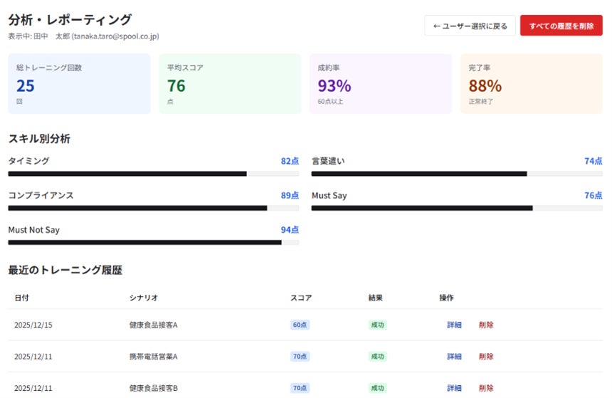 評価結果は販売員ごとに蓄積・可視化され、個人別レポートとして確認することができます。これにより、従来は指導者の経験や主観に依存していた販売指導を、データに基づいて標準化することが可能になります。