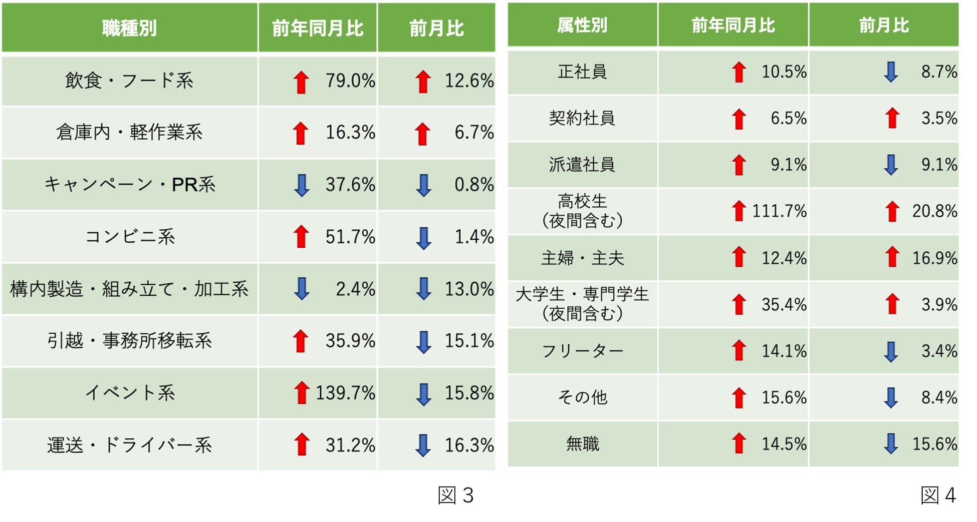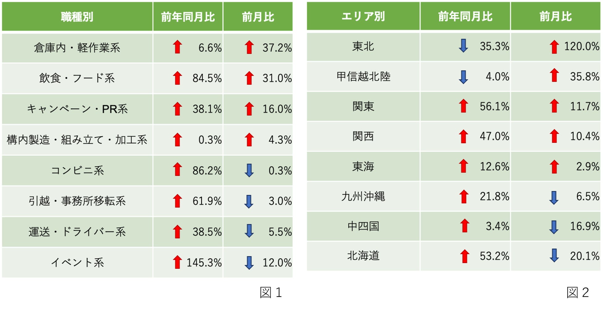 前月比で最も増加率が大きかったのは「倉庫内・軽作業系」で、+37.2%となっており、ついで「飲食・フード系」、「キャンペーン・PR系」となっています。