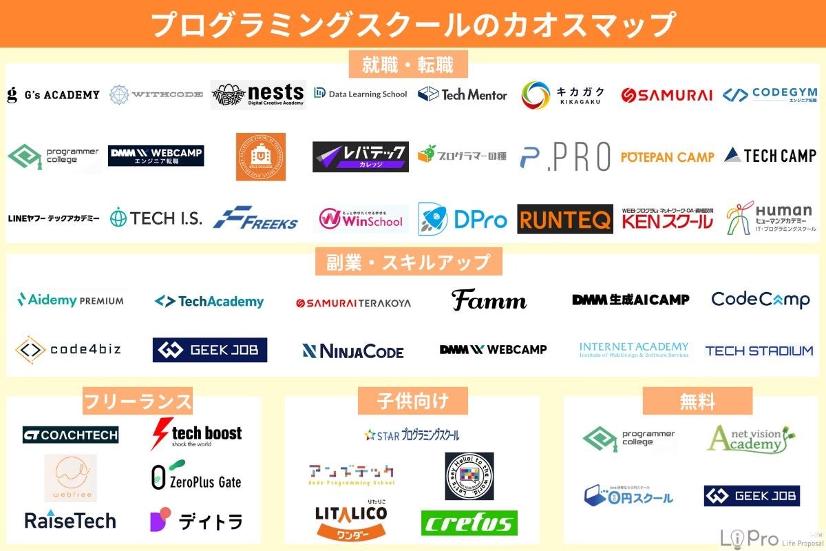 そこで「LiPro(副業)」では、どのプログラミングスクールを選べばよいか迷っている方に向けて、目的別におすすめのプログラミングスクールを分かりやすく整理したカオスマップを作成しました。