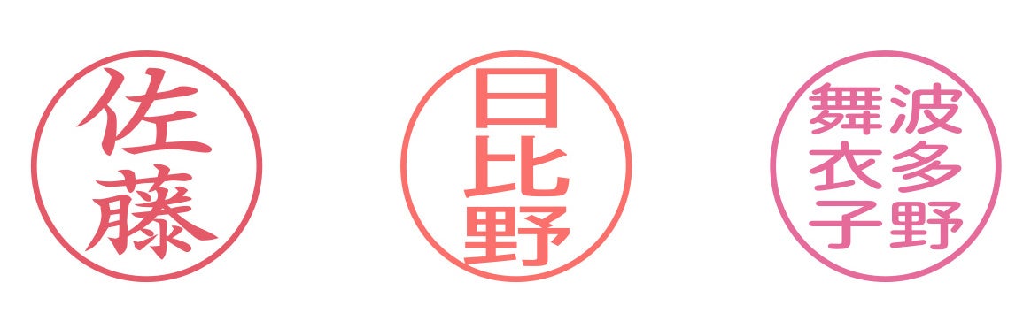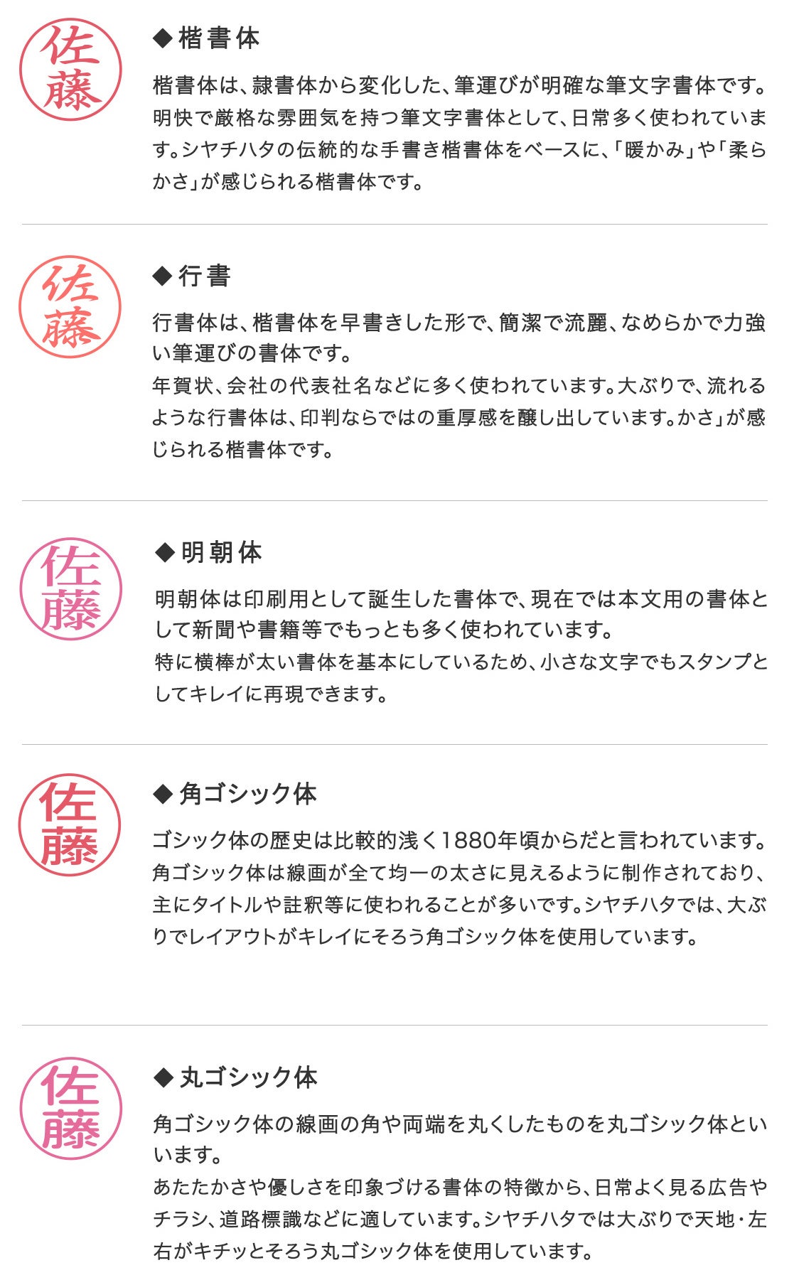 書体:楷書体、行書、明朝体、角ゴシック体、丸ゴシック体