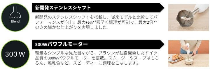 今回発売するMQ1シリーズは、ブラウンのハンドブレンダーの中で最軽量*¹かつコンパクトさが特長のモデルです。重量はわずか610gと軽量ながら、ブラウンが独自開発したドイツ品質の300Wのパワフルモーターを搭載し、スムージーやスープなど「つぶす」「まぜる」といった工程が必要な調理を、スピーディーにサポートします。操作は手元のON/OFFボタンを押すだけでスピード調理が簡単にでき、新採用の「イージーツイストシステム」で本体を回すだけで簡単にアタッチメントの交換もできます。新開発のステンレスシャフトを搭載し、従来モデルと比較してパフォーマンスが向上。最大+6%*³素早く調理が可能で、最大2倍*³のきめ細かな仕上がりを実現しました。