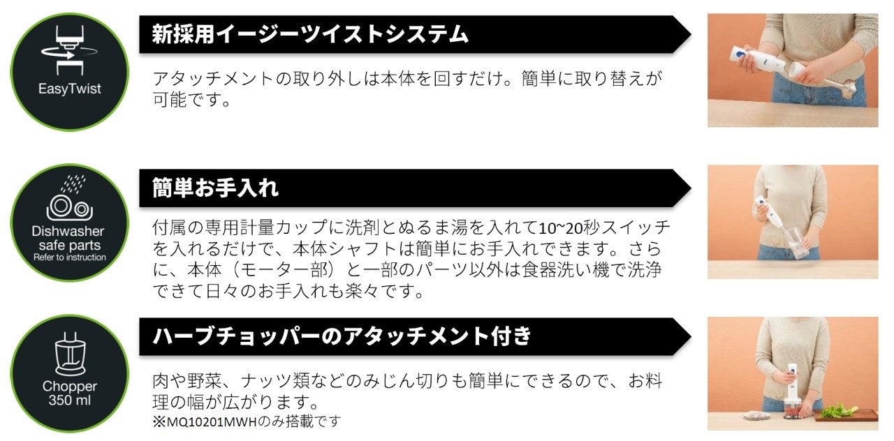 さらに、MQ10201MWHには肉や野菜、ナッツ類などのみじん切りも簡単にできる「ハーブチョッパー」搭載で、お料理の幅が広がります。もちろん、ブラウンのハンドブレンダーの特長である、独自の人間工学に基づいたスリム&フィット形状のグリップで、しっかり握りやすい設計や、本体(モーター部)と一部のパーツ以外は食器洗い機で洗浄できる簡単お手入れ機能はそのまま継承しているので、シニア層の方から、ハンドブレンダーを初めて使ってみたい方まで、幅広い方々に気軽にお使いいただける1台です。