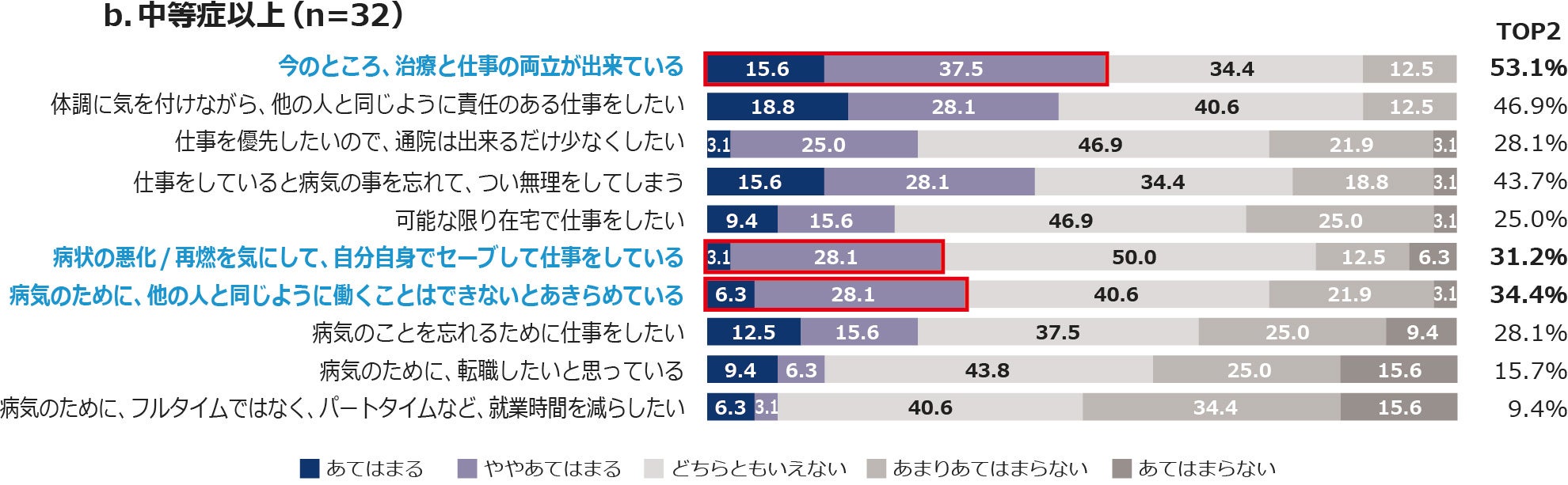 ■ また中等症以上の患者さんでは、「病気のために、他の人と同じように働くことはできないとあきらめている」人が34.4%(11/32)、「病状の悪化/再燃を気にして自分自身でセーブして仕事をしている」人が31.2%(10/32)いた。