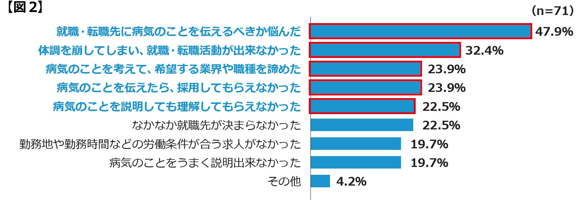 ■ 3人に1人(32.4% 23/71)が「体調を崩してしまい、就職・転職活動が出来なかった」と回答し、23.9%(17/71)が、「病気のことを考えて、希望する業界や職種を諦めた」、「病気のことを伝えたら、採用してもらえなかった」と回答。