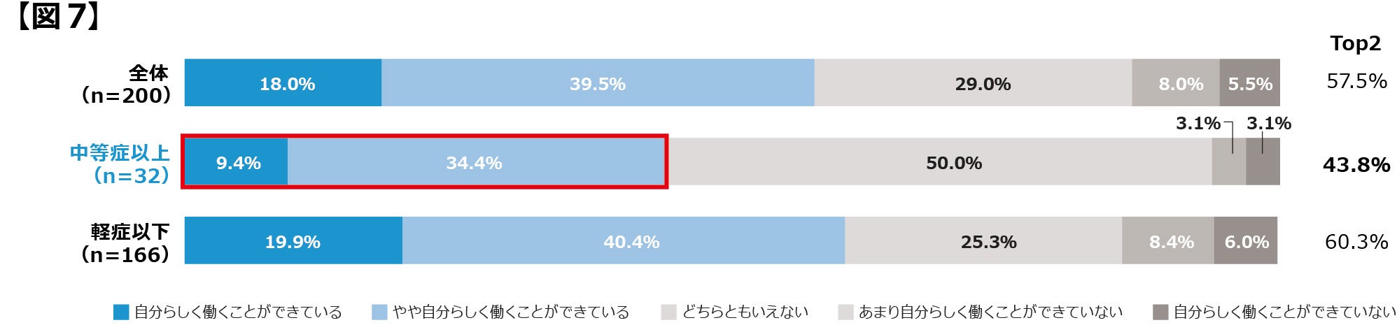 ■ 「自分らしく働くことができている(18.0%、36/200)」もしくは「やや自分らしく働くことができている(39.5%、79/200)」と回答した人は、合計で全体の57.5%(115/200)だったが、中等症以上では43.8%(14/32)にとどまった。